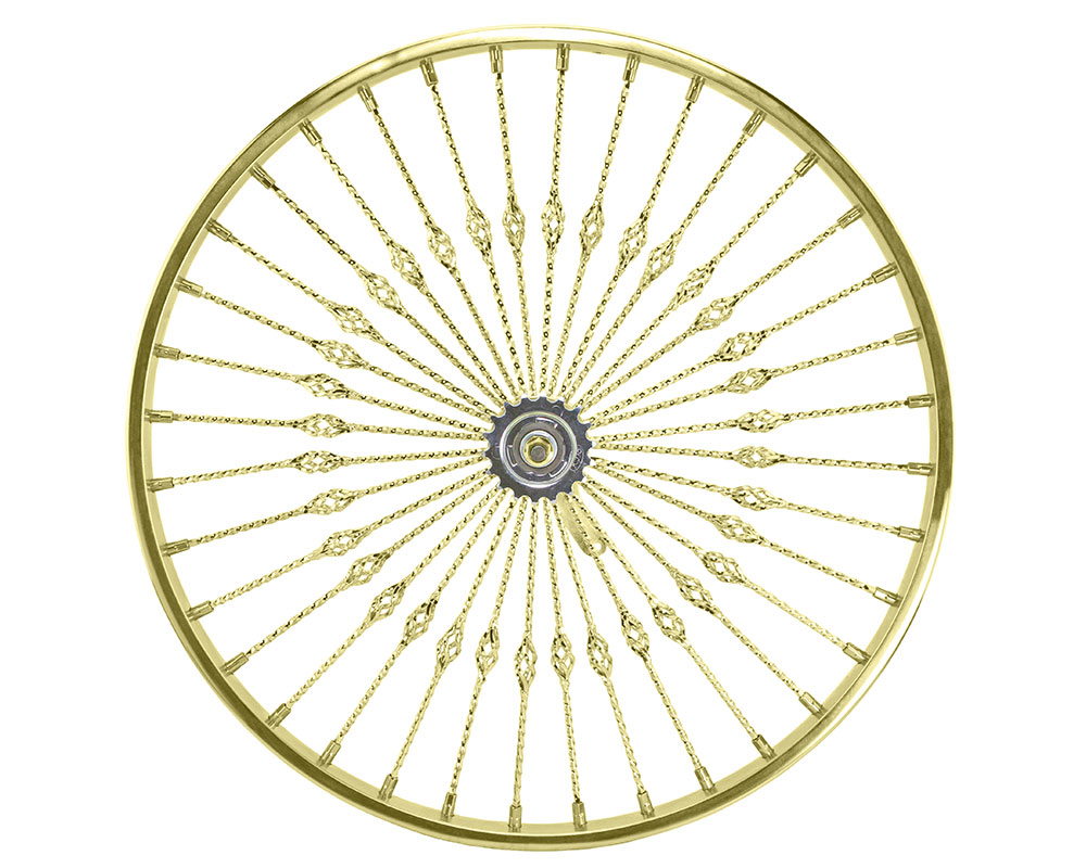 20 Inch x 32mm Steel Front Wheel Twisted Cage 36 Spoke 8GGold 3/8 Axle Single Wall Gold.